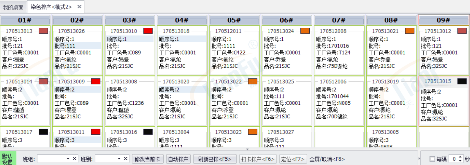 1.訂單排缸、鬆筒計劃、配方單、大小缸排(pái)缸(gāng)、染色合(hé)缸、車間刷卡(鬆筒(tǒng)/裝籠/染色/脫水/烘幹/初(chū)檢/緊(jǐn)筒/成檢/稱重包裝)、質量(liàng)反饋,貫穿染紗生產過程;