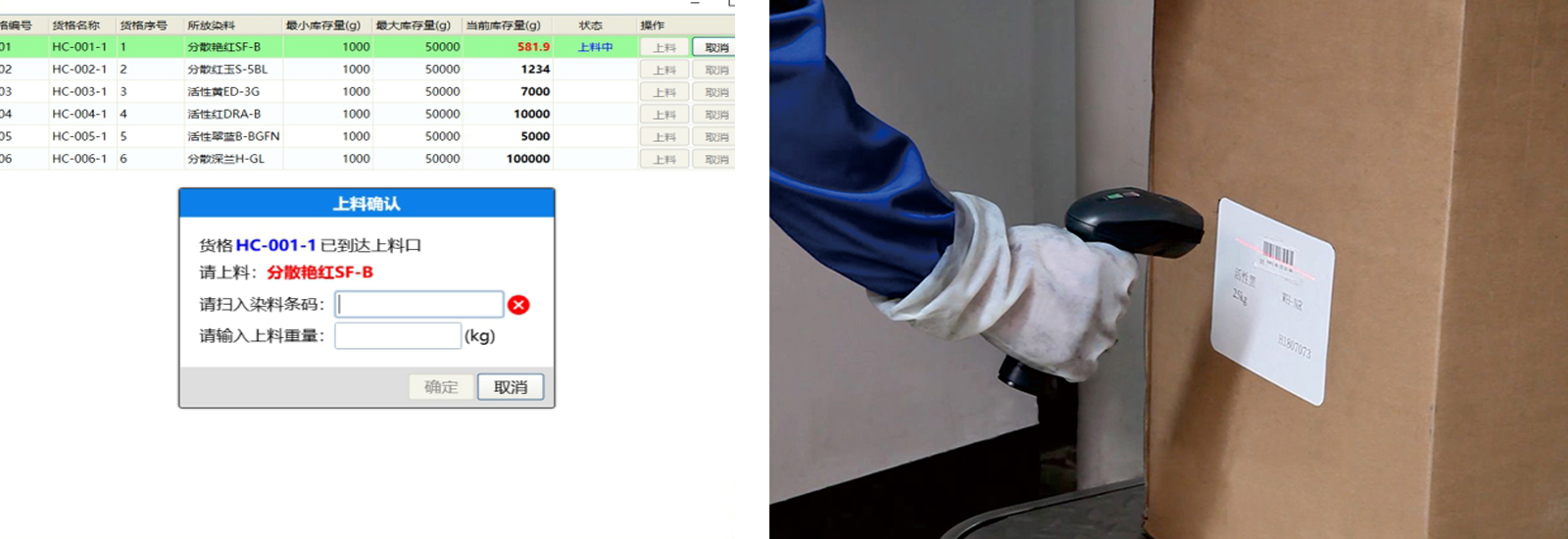 在上料模塊中,係(xì)統根據使用情況(kuàng)自動(dòng)顯示庫位中染(rǎn)料餘量,當某支染料需要上料時係統自動報警提示(shì),操作人員把對應的染料箱運輸到上料口,在係統中確認上料(liào)後,掃描染料箱(xiāng)上的條碼,穿梭小(xiǎo)車會快速的(de)把對應染(rǎn)料的庫位運輸到上料口,其穿梭小車上料效率平均時間(jiān)45秒/箱(xiāng),有效的避免了上錯料的風險。